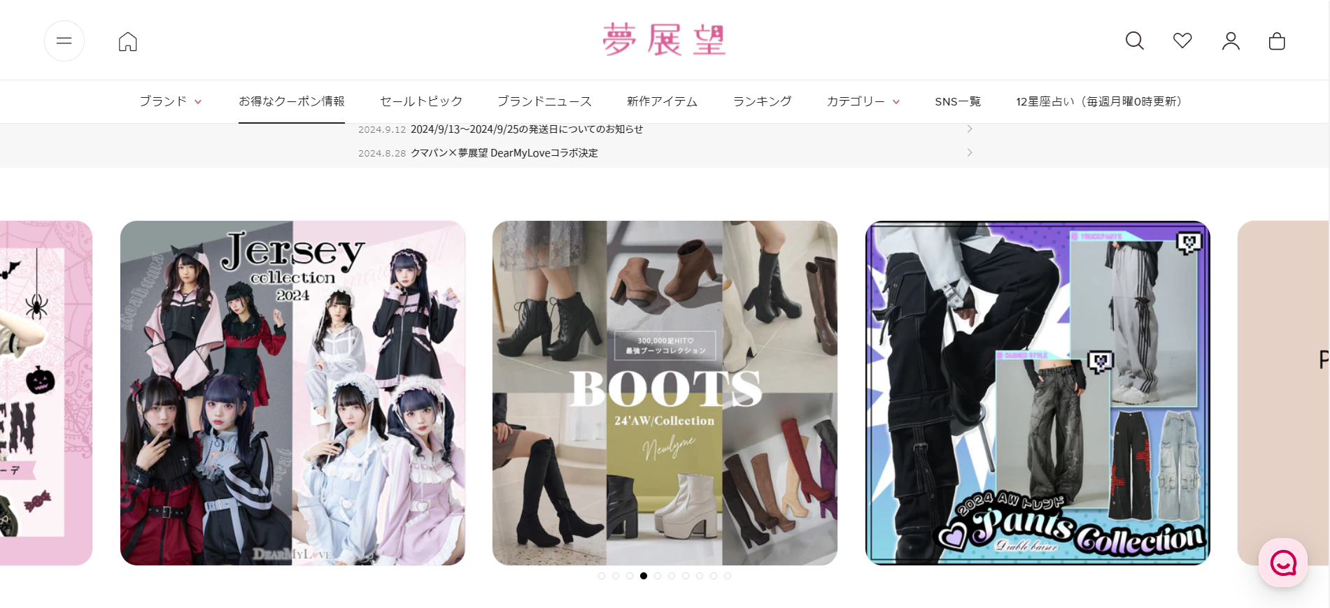 公式サイトはこちら 夢展望について <<夢展望とは?>> 量産・地雷系、ロリータファッション、ギャルファッション、 フレンチガーリー、カジュアル、大人カジュアルなどの幅広いテイストのブランド数を有し10代後半から40代の方までどなたでも欲しいものが見つかります。また、有名モデル、インスタグラマーがディレクターを務めるブランドもあり、靴に関しましても独自開発のアイテムで、他社にはない履き心地でリピーターが続出してます。 12星座占い、骨格診断、ユメマガジンなど毎週見ても飽きがこないコンテンツも◎ 商品名 夢展望 カテゴリ ファッション